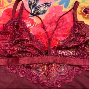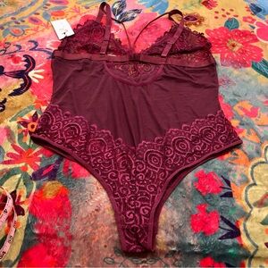 OH LA LA CHERI PARIS lace and mesh stretchy teddy. Beautiful. Size 1X/2X. NWT WINE COLOR