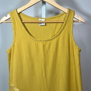 Pullover. Sleeveless. Scoop neck. Yellow cotton gauze with cotton ruffle detail at front and back. Machine washable. Wrinkle resistant. Travel friendly. Resort. Snowbird. Country club. Casual. Generous fit. Midi. J