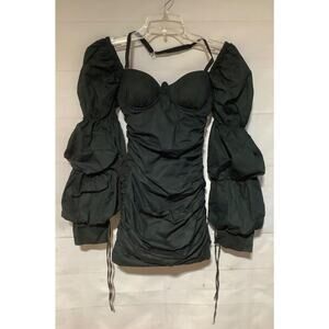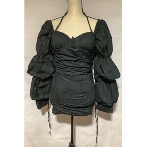 OH POLLY sz 2 black ruched tight fitting dress w/ long puff sleeves
