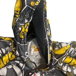 Street-ready print: All-over POW/BANG graphics give pure retro-comic vibes—no two folds look the same.