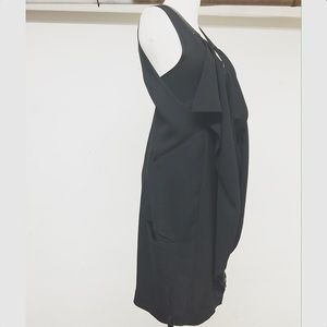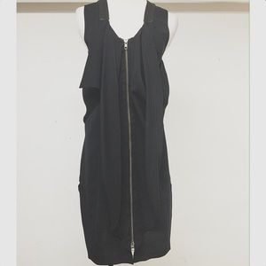 Sleeveless zip up dress with side pockets and ruffle front. Genuine leather accents allng shoulder. Single hidden back pocket . The care tag has been removed. Never worn. Exact measurements are as follows 37 1/2” length, 10” v neckline, 16” waist, 18” hip line. Lined. Retail $550
