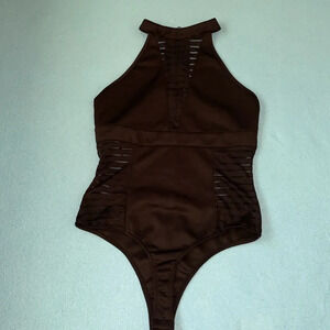 OHYES FASHION choker mock style mesh in all the right places, thong bodysuit zipper back, snaps at crotch, 2 adjustments. Pictures do not do this sexy bodysuit justice!!