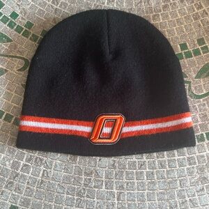 Black beanie with orange/white stripes. Has OSU logo on one side and the O on the other