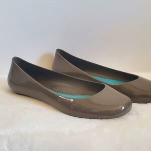 Oka B Taylor Grayish Brown Rubber Jelly Ballet Slip On Flats. Women's size US 8, EU 38. Premium arch support & heel cup for stability and support, soothing massage beads, flexible shoe design for all day comfort, 100% recyclable (plastic #3). BPA, latex, rubber & phthalate-free. Waterproof & slip resistant, machine washable, color won't fade. Made in the USA. Minor discoloration on side of shoe as shown in last photo, otherwise is great condition!