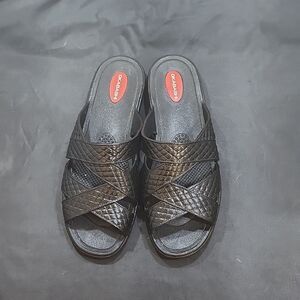 OKABASHI CROSS STRAP WOMEN'S SANDALS SIZE MEDIUM COLOR BLACK with Red Logo in the insole Cross Strap Eco-Friendly Women's Sandal Made in USA Okabashi Shoes Simple style and comfort make the Cross Strap sandal one of our most classic and versatile women's shoe styles. Perfect to wear around the house and on your everyday errands.Premium arch support and sculpted heel cup for stability and support provide proper alignment to help prevent and reduce foot pain.