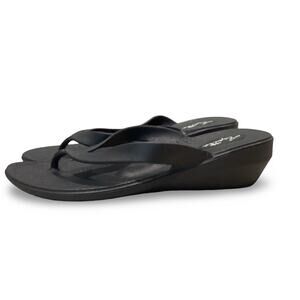 Black thong wedge sandals by Okabashi in very good preowned condition. Very minor signs of use.