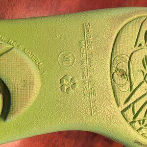 HAPPY SUMMER SZ ML (9/10) OKAL RUBBER SLIDES BRIGHT LIME GREEN W PINK AND GREEN STRIPE BOW LIKE NEW SUPER CUTE WITH MASSAGING FOOTBED