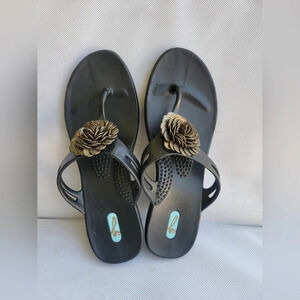 OKAb black flip flops/sandals (sz med/lg). The sandals are in great condition. The flower on the toe is gold. Please see all pictures.