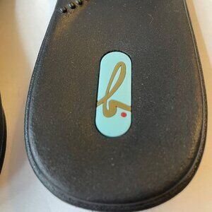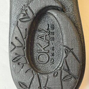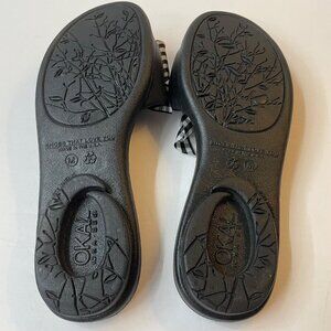 OKAb Madison Slide Sandals With Gingham Check Bow. Size Medium (6.5-7.5). See last 2 pics showing size chart and measurements of shoe. Extra durable, one-piece construction and straps that lie flat against your feet to prevent chafing. Premium arch support and heel cup for stability and support. Soothing massage beads. Flexible shoe designed for all-day comfort. Shoe is 100% recyclable (plastic symbol #3) and made from a blend of used shoes, scrap material, and our own proprietary bio-based material. Bio-based material contains 45% soy by weight and is BPA, latex, rubber, and phthalate-free. Waterproof and slip-resistant. Colorfast shoe material - color will not fade. Made in USA. Excellent preowned condition.