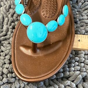 Stylish sandals featuring vibrant blue accents. Perfect for casual outings. Faux stones