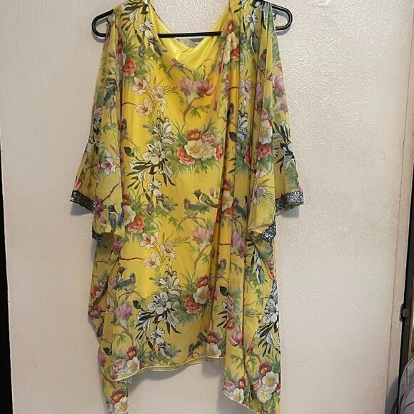 OKCU Tunic top, yellow floral/birds print.Chiffon overlay, sequin trim. Kimono.