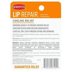 O'Keeffe's Lip Repair Cooling Moisturizing, Long-Lasting Matte Lip Balm provides the same incredible results customers have come to expect from O'Keeffe's moisturizers now in a lip balm! O’Keeffe’s Cooling Lip Repair is hardworking skincare that provides instant relief to extremely dry, cracked lips. This Lip Repair item is a highly effective lip balm that heals, relieves, and repairs extremely dry, cracked lips. When used daily, O’Keeffe’s lip repair is clinically proven to provide instant relief and all-day moisture in one use, create a flexible barrier and heal dry, cracked lips, protect against dryness all day, even while you eat and drink, and absorbs quickly to provide soft, smooth lips. O’Keeffe’s lip repair comes in cooling relief. Cooling relief is for those who enjoy the sensation of peppermint flavor. Two sticks per pack.