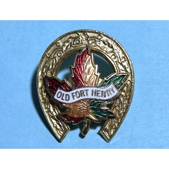 This lapel pin or brooch features a horse shoe and maple leaf design, representing the historic Old Fort Henry in Ontario, Canada. The pin is a unique collectible item for anyone interested in Canadian history or memorabilia.