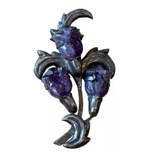 OLD MEXICAN SILVER BROOCH CARVED AMETHYST TULIP FLOWERS Pin VTG 3.75”