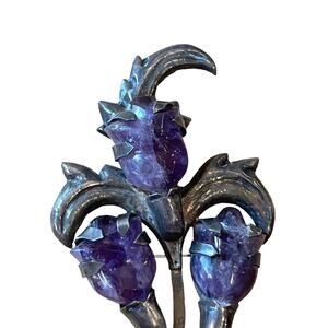 This vintage Mexican silver brooch is a stunning piece of jewelry that features a beautiful amethyst tulip flower design. The brooch is handmade and signed, making it a unique and authentic piece. The antique piece is made of 925+ sterling silver ( at least 925, if not higher) and has a prong setting style. No flaws to note. Could use a polishing if you’d like it shiny.