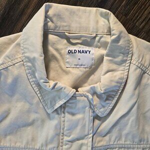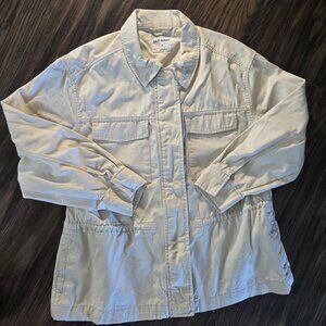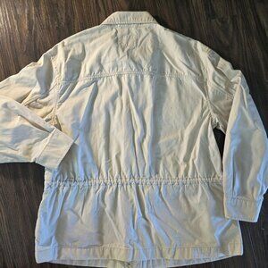 Great, lightweight, mid-length 100% cotton twill trench coat from OLD NAVY. Cream-colored. Long-sleeves. Zipper and snap front. Drawstring waistline. Front pockets. Snaps on sleeve cuffs. Snaps on collar...can be worn as a mock turtleneck or open. New without tags and in new/excellent quality and condition. Very nice coat! SIZE M/MEASUREMENTS: pit - pit = 22" x 28" long.