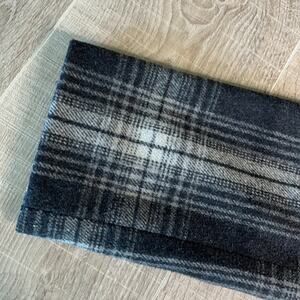 This Old Navy wool blend coat features a black and grey plaid color, long sleeves, a collar and double buttons down the front.