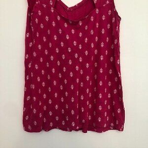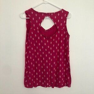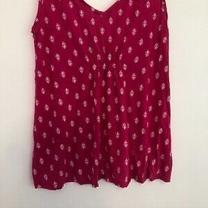 Bright magenta pink with white geo floral print blouse top. Sleeveless tank. V-neck. Ruched gathered detail. Keyhole cutout back. Boho bohemian peasant spring summer travel vacay vacation beach