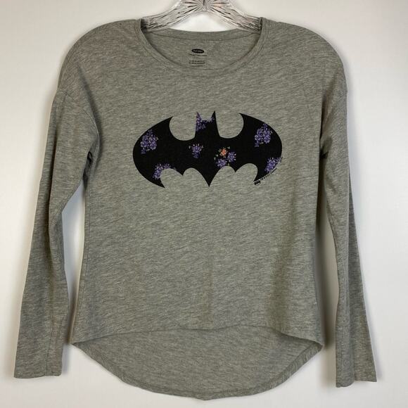 Old Navy Collectible long sleeve t-shirt. Gray with floral Batman logo. Hi-Lo hem. Size large. Excellent used condition. No flaws detected. Please check measurements provided for fit.