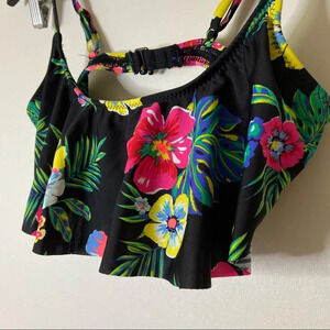 • black background with multicolor Hawaiian tropical flower design and greenery. flowy bikini top with adjustable straps. not padded or cupped, just an extra layer of black lining material.