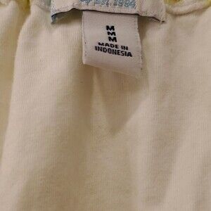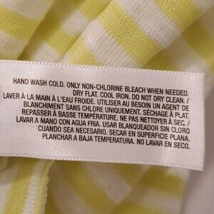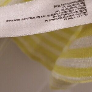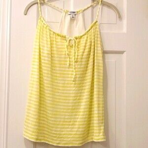 Adjustable halter top in citrus-y strips. Built in bra. Light, airy and a bit sheer (though not where bra is.) Perfect for summer or layering for spring. Color hard to capture but best reflected in cover photo (more of a yellowish lime green). Rayon/poly/cotton/spandex. Pre-owned in excellent condition.