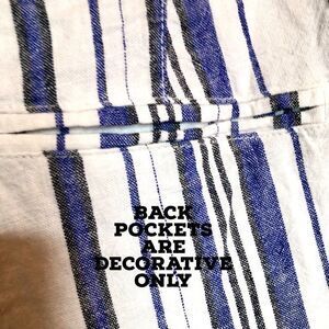 These shorts are so cute! Old Navy makes these blue striped linen-blend shorts in ladies size 6. They’re new without tag. Zipper and button front closure, front hand pockets and back hip pockets (decorative only). They’re made of 55% linen and 45% rayon, so machine wash in cold on gentle cycle and tumble dry on low. The waist circumference is 34”, the inseam is 5” and the rise is 10”. Totally summer vibes!