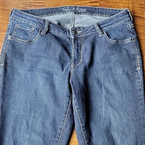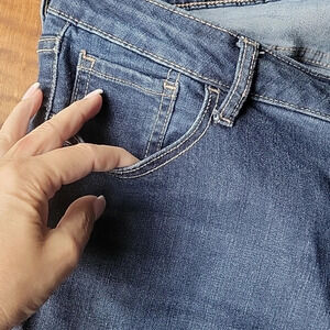 Midwash denim with stretch; slim cut. Classic 5-pocket styling.
