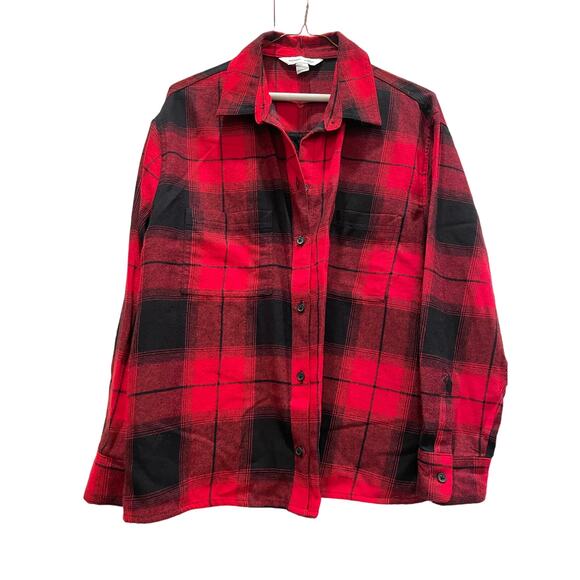 Red and Black Plaid Old Navy Boyfriend Shirt. this has been worn once. has a boxier fit more like a Shacket in my opinion. Has side slits at hips. Great layering piece or can be worn on its own. In excellent shape. Perfect for the holidays. is lightweight. great for Christmas or Valentines Day