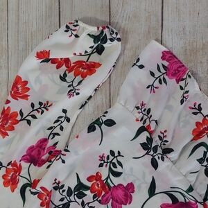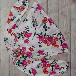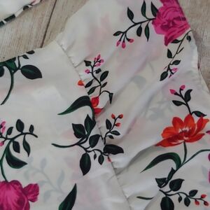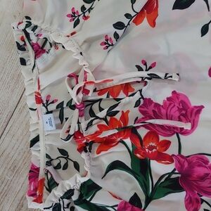 Amazing floral! 3/4 sleeves with elastic cuffs. Flowy with peplum hem. Ruffled neckline with tie. Semi-sheer and perfect for spring. (U1)