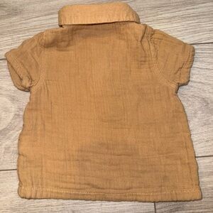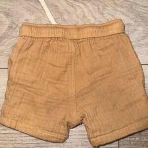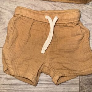 Adorable tan baby outfit set with a short-sleeve top and matching shorts. Features button details and a front pocket.