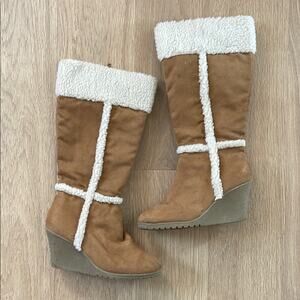 OLD NAVY Tan and Cream Faux Suede Sherpa Knee High Wedge Boots Size 7
