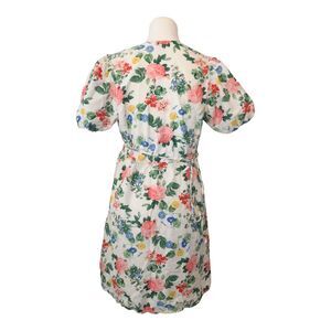 This Old Navy wrap dress brings an airy, romantic touch to everyday wear. Crafted from a soft linen-cotton blend with a white base and lush floral print in pink, blue, yellow, and green hues, it features a V-neckline, short puff sleeves, and an adjustable wrap tie waist that flatters the silhouette. Size medium. 55% linen and cotton.