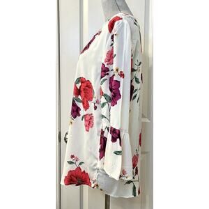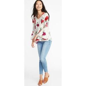 Add a pop of color to your wardrobe with this Old Navy tunic blouse. The V-neckline and 3/4 bell sleeves give it a chic and stylish look, perfect for any occasion from casual to workwear. The lightweight and breathable 100% Rayon fabric makes it ideal for summer and spring, and it comes in a beautiful red color with a fun floral pattern. This blouse is perfect for any woman who loves to add a touch of bohemian and colorful flair to her outfits.