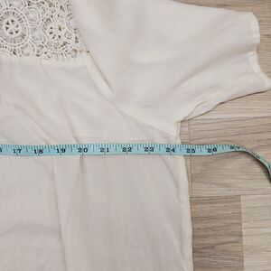 Elevate your style with this stunning Old Navy blouse. Made of 100% cotton, this ivory white blouse features beautiful crochet accents and a sheer fabric that will make you feel like a bohemian goddess. The blouse has a round neck with a button closure and short sleeves, making it perfect for both party/cocktail events and casual outings.