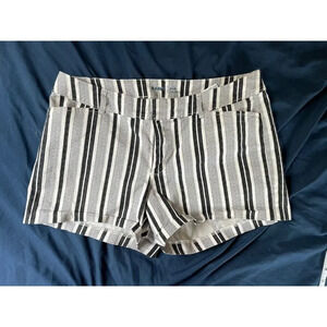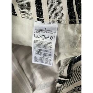 Old navy pixie canvas shorts in black and white striped pattern. Zip fly with two hook and loop closures at the waist. Old navy logo is peeling on the interior waistband. Slash front pockets. In good condition. Size women’s 8. Approximate measurements: