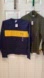 One navy blue crew neck shirt with yellow gold band at chest and Old Navy logo