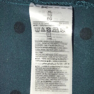 Beautiful green teal color with black polka dots. Button collar, button cuffs. Rounded sides at bottom. Pictures just don’t do it justice!