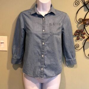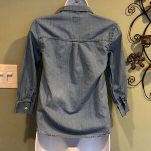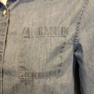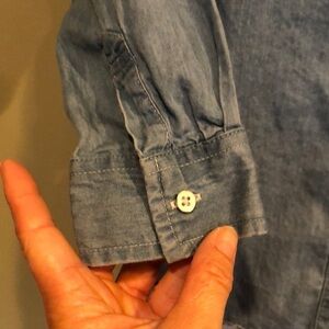 Excellent condition. Material tag was cut out by my daughter. It’s a Cotton Blend. Machine washable. One front pocket. Buttons on the sleeves allow for it to be rolled up if desired. Great everyday top or as a very light jacket when layered. Smoke free home.