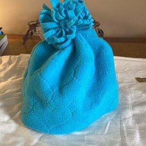 The turquoise color gives it a bright and cheerful look, while the heart pattern adds a touch of interest. The pom-pom on top adds a fun and playful touch.