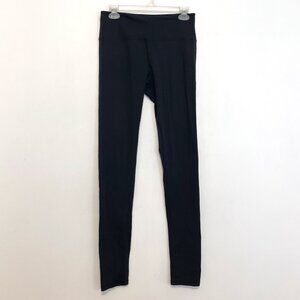 ◇ size 6. Solid black. Pull on / elastic waist. Wide waistband. Logo on back of calf / leg. Seems to be high waisted high waist / high rise. Hidden media pocket inside waistband. Has stretch. Active leggings active legging