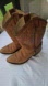 Stylish brown cowboy boots with intricate stitching. Perfect for a Western look.