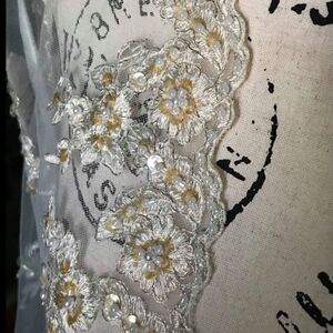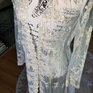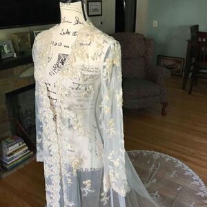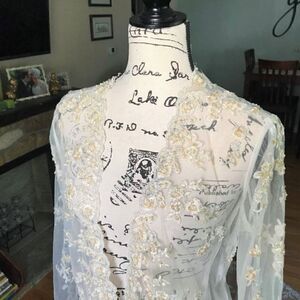 Absolutely gorgeous sweep train bridal jacket. Wear it over a simple A-line dress during the ceremony for a dramatic entrance. Absolutely covered in delicate lace and pearls. Also comes with a complimentary veil. More of an ivory than a white. There is some discoloration to the sequins from age.