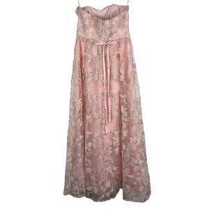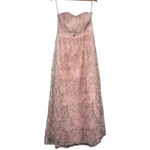 DETAIL: SWEETHEART WITH GATHERING. RIBBON BANDED WAIST WITH TIE IN THE BACK. TULLE METALLIC DESIGN LAYERED OVER PINK LINING. ZIP DOWN BACK.