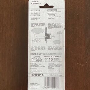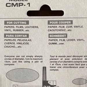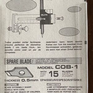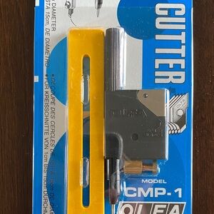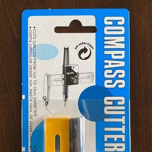 Olfa compass cutter for precise circle cutting. Includes 6 replacement blades. Cuts precise circles from 0.4" to 5.8" in diameter. Includes a special rubber pad to prevent a pinhole on your project. Can be used to cut paper, film, vinyl, leather, rubber, etc. Made in Japan.