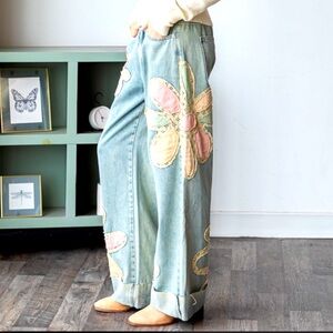 Stylish wide-leg jeans with colorful floral patchwork. Perfect for a trendy look.