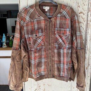 OLI & HALI BROWN PLAID MIX MEDIA DISTRESSED PLAID ZIP JACKET