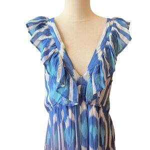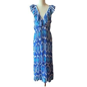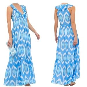OLIPHANT ODISHA BLUE RUFFLE V NECK MAXI DRESS COTTON SILK LINED SUMMER PARTY LG