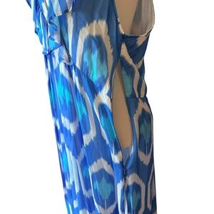 Womens size Large, 80% cotton, 20% silk, maxi length, deep v-neck, ruffle collar, side zipper, lined, sleeveless, abstract print.