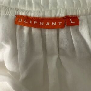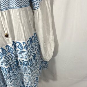 Oliphant is known for its globally inspired prints and breezy, travel-ready silhouettes. This white and blue long sleeve tunic dress is crafted from lightweight cotton with intricate embroidery-style print, making it ideal for vacations, resort wear, or casual spring and summer outings.
