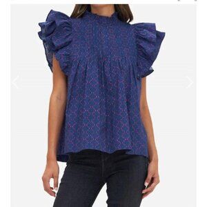 Printed blouse with pintuck detailing and ruffle sleeves.